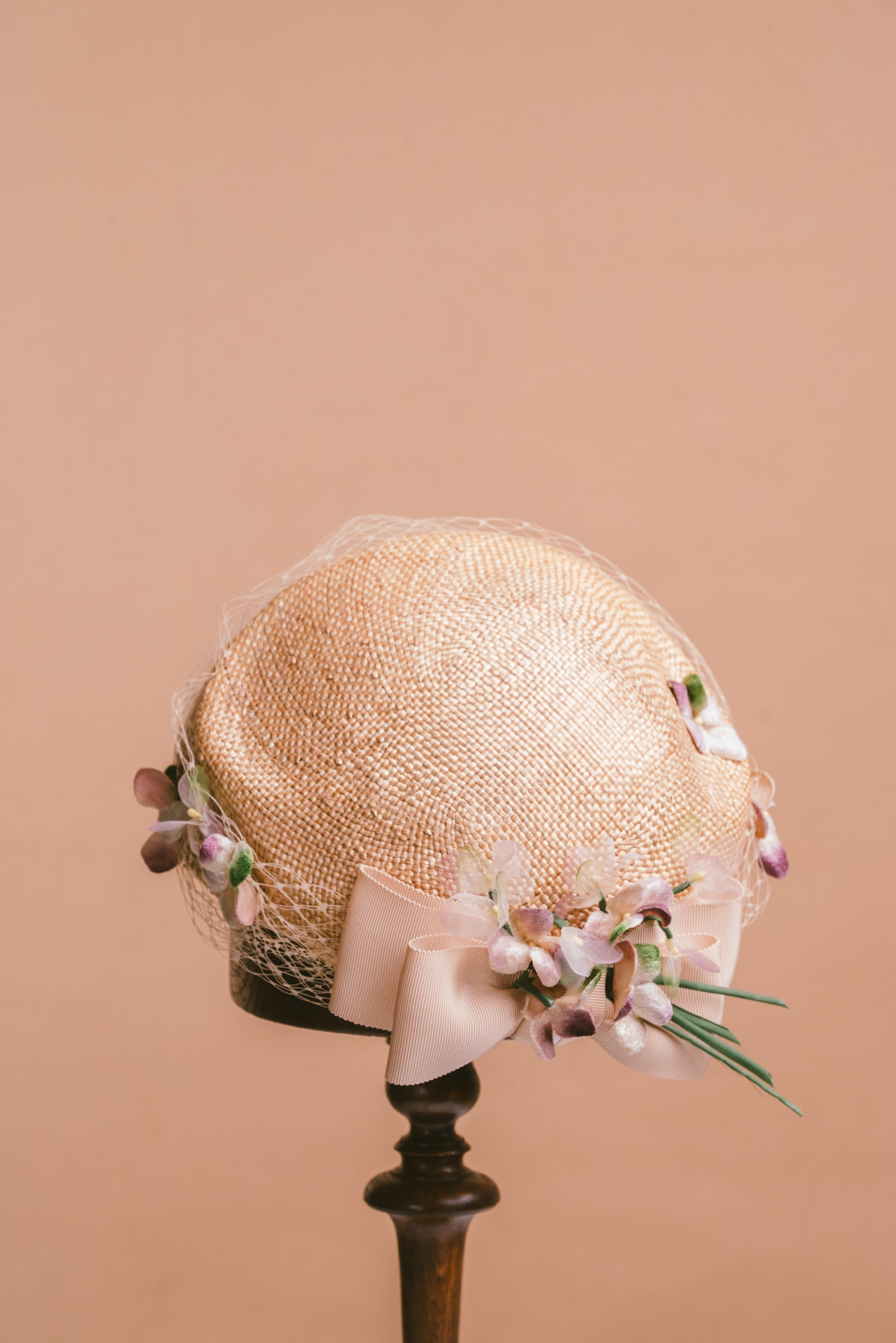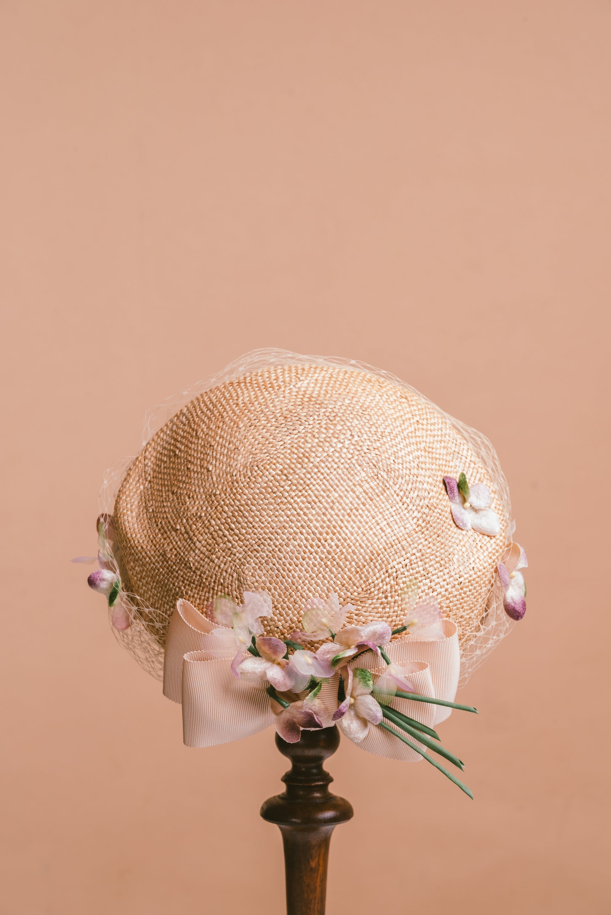 The bluebell is a half hat perched at the back of the head, trimmed with veiling, faux flowers and ribbon to give a hint of 60s.